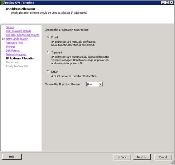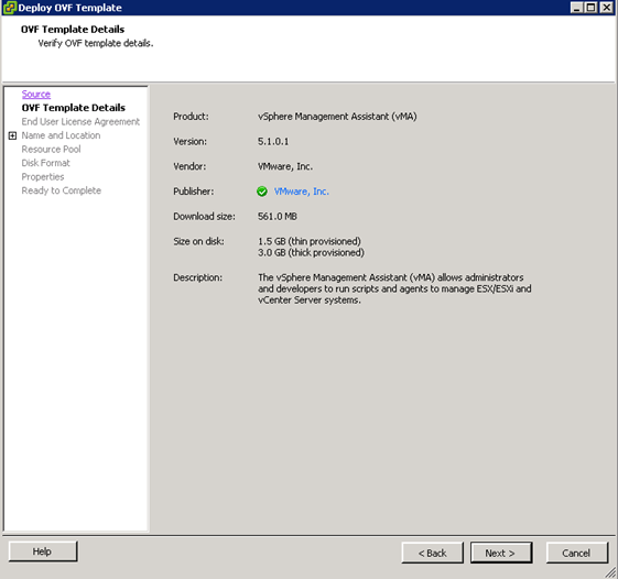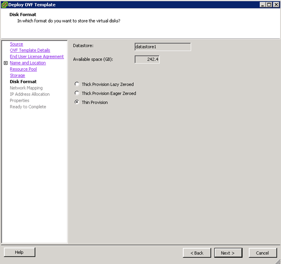 - I prefer thin provisioning…especially for the VMA’s. Click the “Thin Provisioning” radio button and then click “Next“.