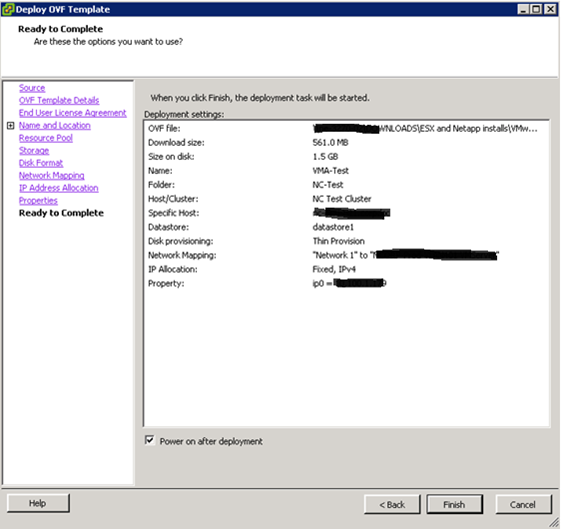 - Verify all of the settings, click the “Power on after deployment” box, and then click “Finish“.