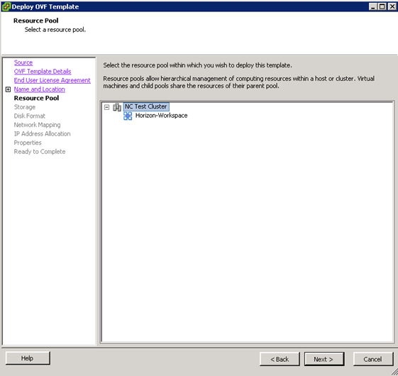 - We don’t use resource pools. Select the top level cluster and then click “Next“.