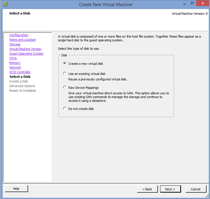 11. Select the “Create new virtual disk” radio button and then “Next”.