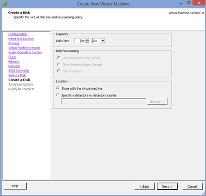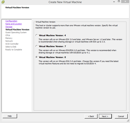 5. Make sure that the “Virtual Machine Version: 8” radio button is selected. (5.1 is using version 9 so I am not sure why this can’t be selected here. We will change this later.
