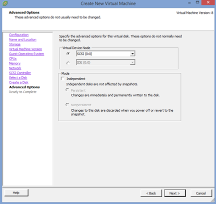 13. Take the default virtual device node. For the system partition you want this to be SCSI 0:0. Click “Next”.