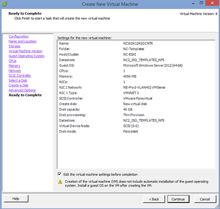 14. On the summary screen click the “Edit the virtual machine settings before completion” box and then click “Continue”.