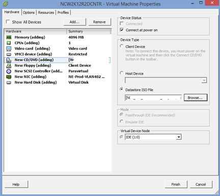 16. Click on the CD/DVD and then choose the datastore location that you have the 2012 R2 install ISO. Make sure under Device Status that “Connect at power on” is checked. Now click “Finish”.