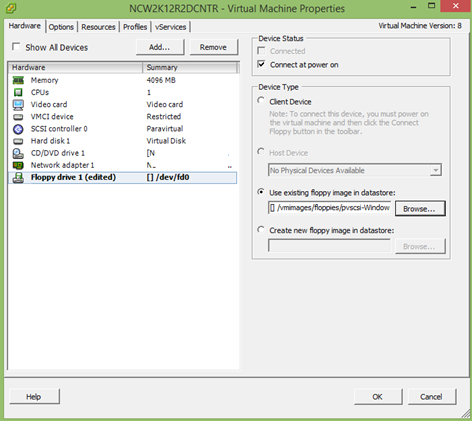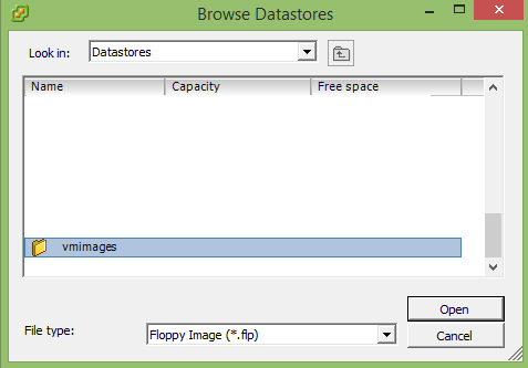18. Click on the Floppy drive 1 and choose the “Use existing floppy image in datastore” radio button. Then click “Browse”. At the bottom of the datastores you should see a folder called “vmimages”. Double click this folder. (For some reason until the VM is created this folder does not show up and that is why we had to create the VM and then go back into the settings to change this).