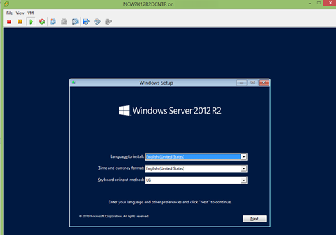 24. The VM should boot into the 2012 R2 setup screen. Choose your language and then “Next”.