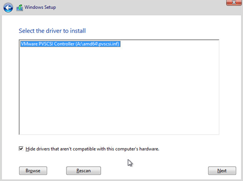 32. Select the “VMware PVSCSI Controller (A:\amd64\pvscsi.inf) and click “Next”.