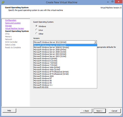 6. Select the “Windows” radio button and then choose “Microsoft Windows Server 2012 (64-bit).