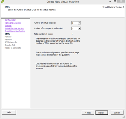 7. Take the default of 1 virtual socket and 1 core per virtual socket.