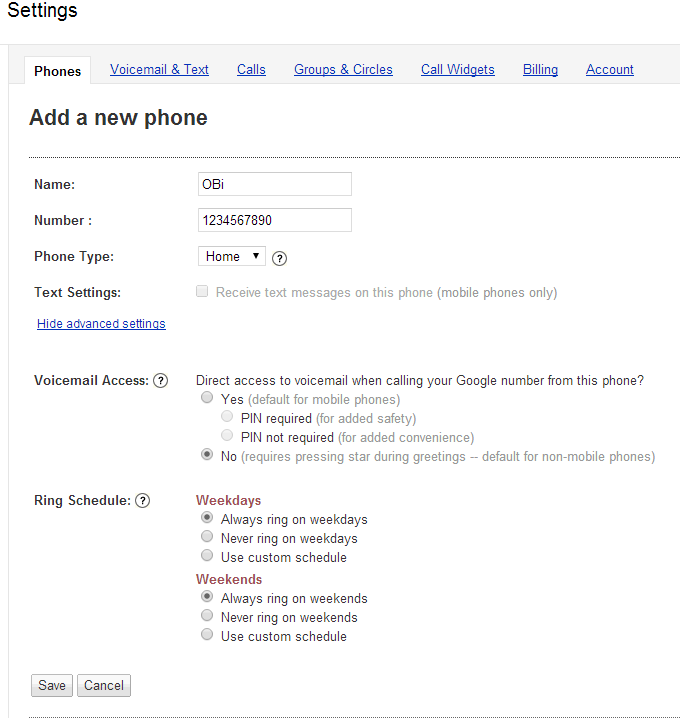 Time to forward my Google Voice number to my new Vestalink number. Go to Google Voice and click the little settings gear at the top right and then click Settings. On the Settings page under the Phones tab click the Add another phone link at the bottom of the page. Type a new name…I used OBi and then put the Versalink phone number that your wrote down earlier…right…:) Click Save. Google will require that you verify the number by Google Voice calling the number and requiring that you enter a 2 digit code. After verifying the forwarding number go back to the Vestalink Dashboard.