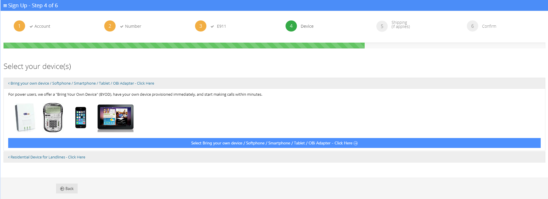 Now to select your device. I had the Obi, so I clicked on the “Bring your own device / Softphone / Smartphone / Tablet / OBi Adapter – Click Here” link. To continue you then have to click on Click Here.
