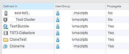 By the time you are done, your script service account should have rights in vCenter for the Cluster (no propagate), host where the clone will live (no propagate), the Datastore, Network, Folder, and DC that will be cloned.