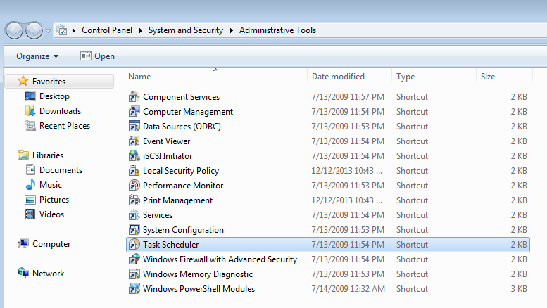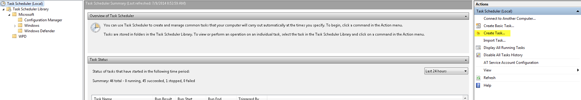 Once you have created the clonedc.ps1 script we need to get it set up as a scheduled task on the physical machine. Log in using the script AD account that you created earlier, then go to Control Panel –> System and Security –> Administrative Tools –> Task Scheduler. Click Create Task.