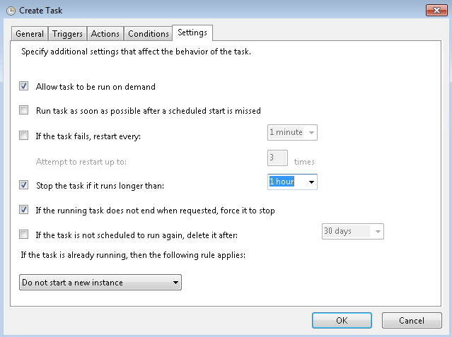 If you want to allow this to run on demand then check the Allow task to be run on demand box. Check the Stop the task if it runs longer than box and choose 1 hour from the drop down. Check the box If the running task does not end when requested, force it to stop. Click OK. You will be prompted to enter the credentials for the account running the task and then click OK.