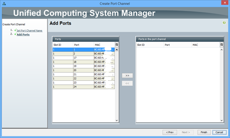 - Select which ports are going to be used in this port channel group. Make sure you hit the >> button to move them over to be in the port channel. Click Finish.