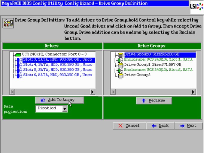 Now we see the four unconfigured drives on the left side. Click the first one, then click “Add to Array“.