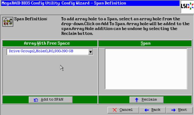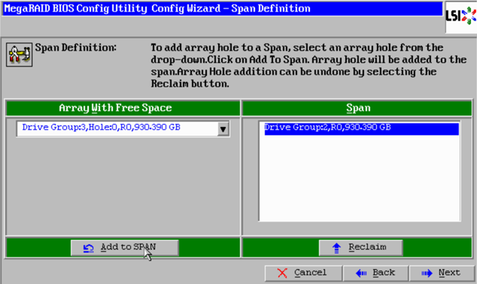The Disk Group appears in the right window under Span. Click “Next“.