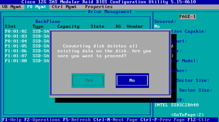 - Highlight the disk and then press “F2“. From the menu click “Make JBOD“.