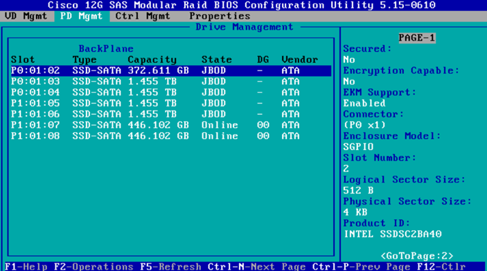 - Press “Ctrl-P” or “Ctrl-N” to switch pages. One of the pages should show your disks and the slots they are in. We have a problem here. The only option for my 400GB SSD is to erase the disk because it has the state of “Foreign“.
