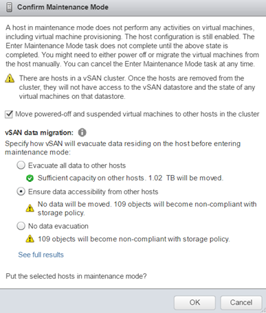 - Best practice would be to work on one host at a time. Put the first host in maintenance mode, and choose to “Ensure Availability”.