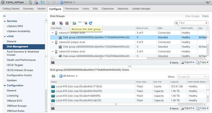 c - Now click on your cluster, then click the “Configure” tab and then click “Disk Management“. Click on the host that you removed the disk from earlier and then choose “Add disk group” button. Choose your cache disk and your capacity disks and you are ready to go. Take your host out of maintenance mode and repeat steps on each host.