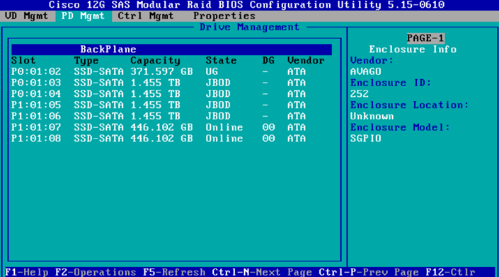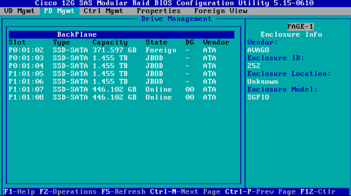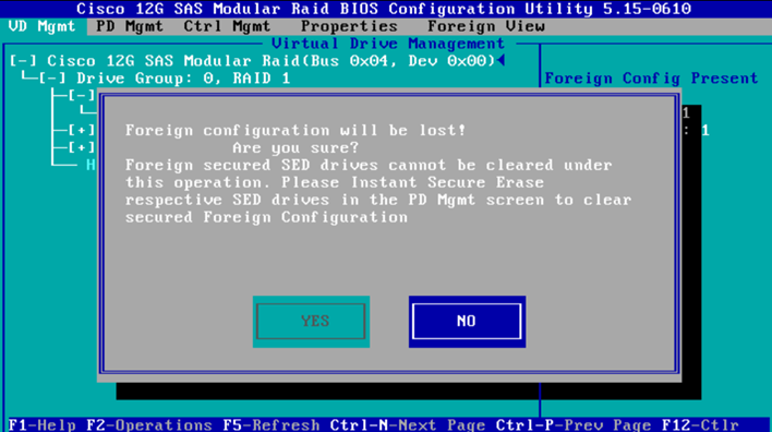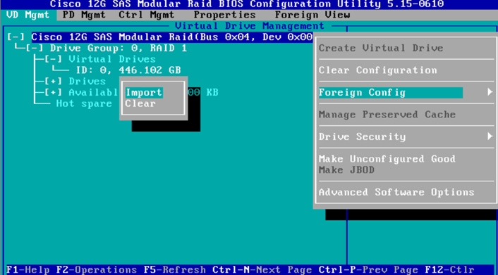 - Switch pages to the “Virtual Drive Management” page and then on the Cisco 12G SAS Modular Raid press “F2“. This will give a menu; select “Foreign Config” and then “Clear“.