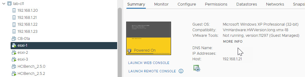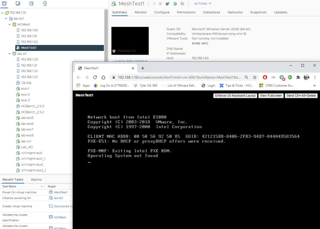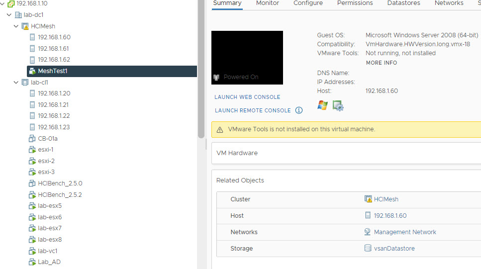 Let’s power up the VM. We now have a VM deployed in our HCIMesh cluster using the vSAN datastore from my lab-cl1 cluster.