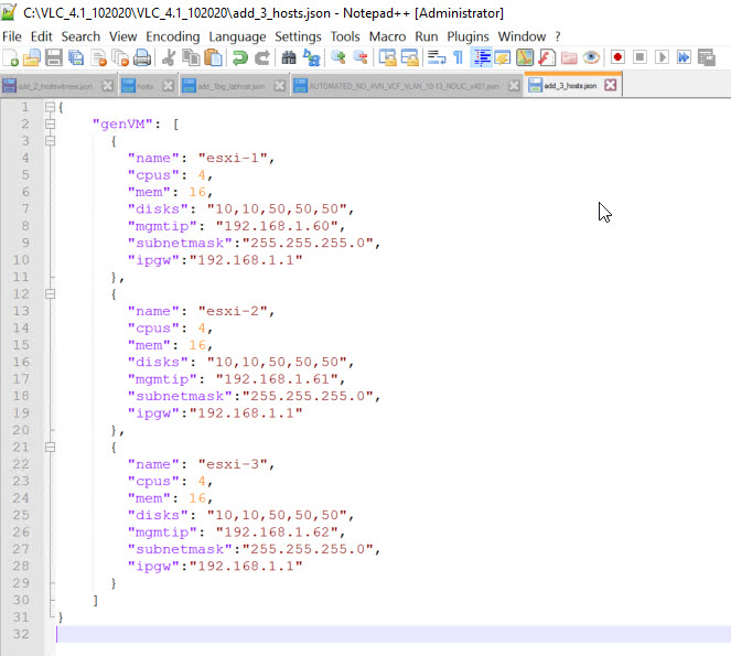 Using your favorite editor, edit the “add_3_hosts.json” file. Change the name as you see fit for each host. You can increase or decrease CPU, Memory, and the disks being added to these VMs. Set the management IP information as well. I have included the code for my installation. Once complete, save this file.