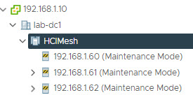 Now create a new cluster and add these three hosts to the cluster. When completed you will have 3 hosts in a new cluster that are all in maintenance mode.