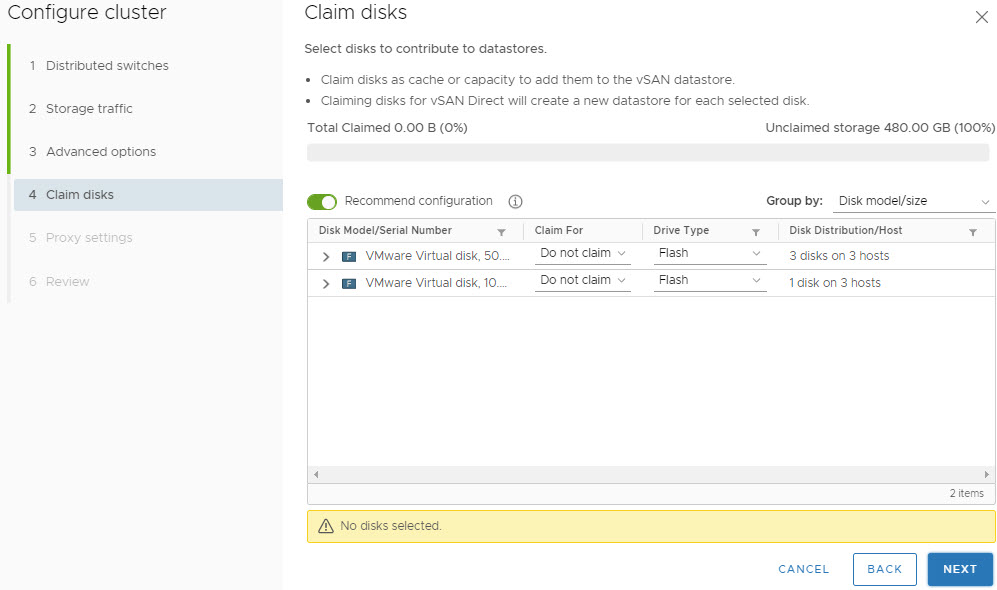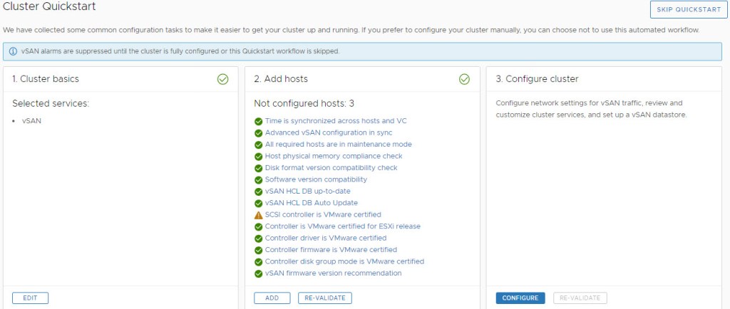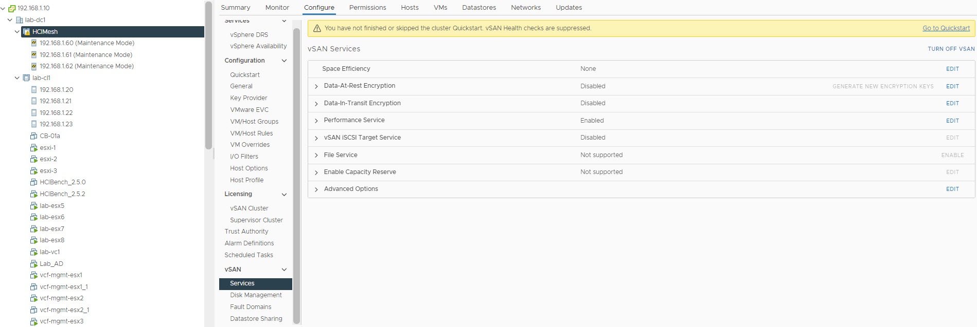 We now enable vSAN on the cluster by right clicking on the cluster, choosing Settings–>vSAN–>Services–>Configure. I went with the default options and did not choose any disks to be consumed for vSAN so my vSAN datastore shows 0 capacity and 0 free space. We will use Quickstart to configure the hosts further. If I enable vSAN and then try to use Datastore Sharing, it won’t let me configure it because the required vSAN networking is not configured yet.