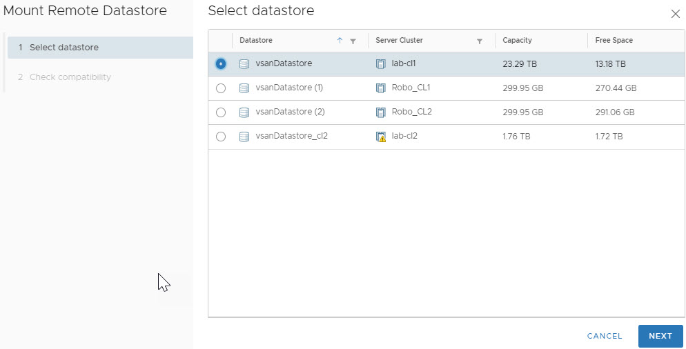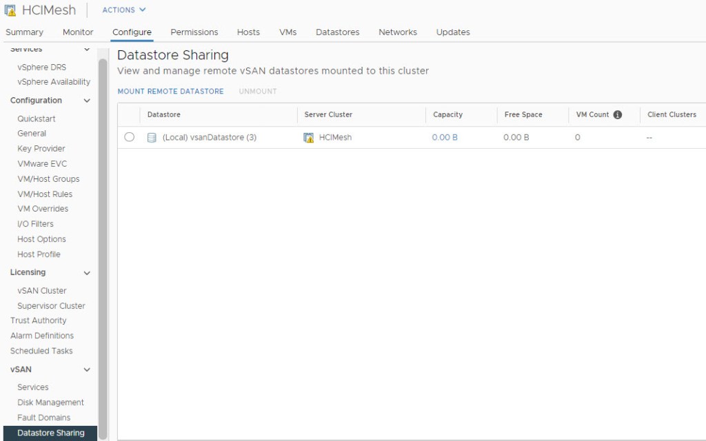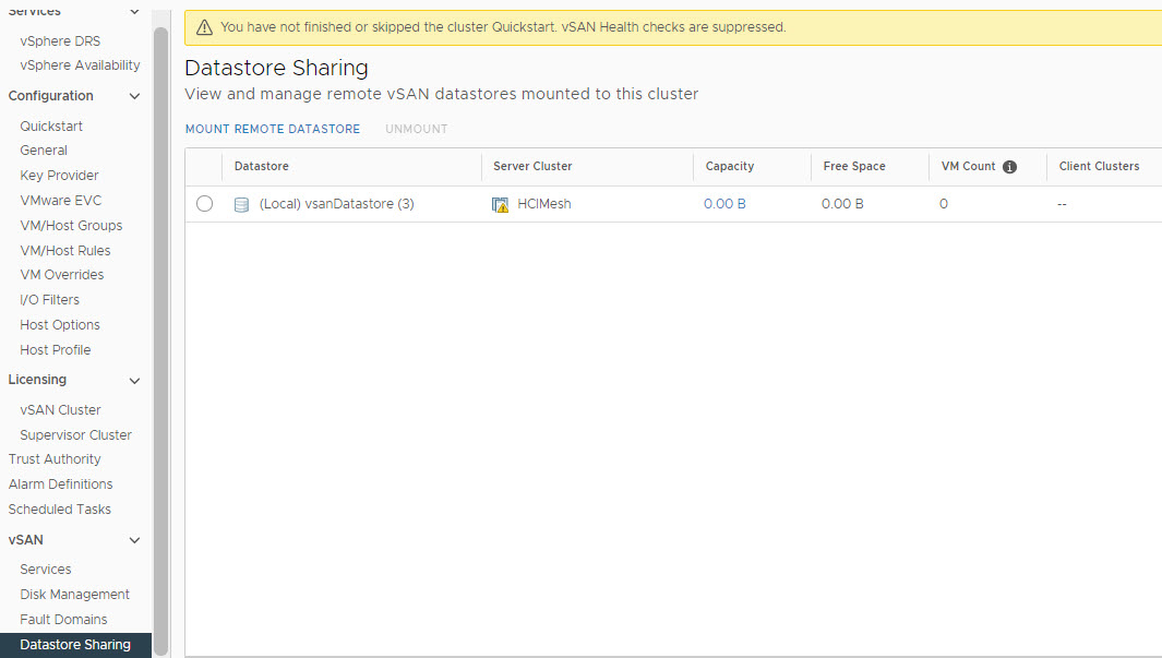 Once the changes are complete from Quickstart, click on your cluster, then “Configure”, and then Datastore Sharing. Notice I still show a vsanDatastore (3) but it has not space. Click “MOUNT REMOTE DATASTORE”.