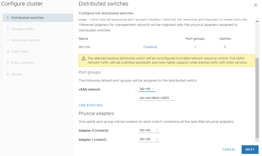 Click on your cluster–>Configure–>Quickstart. In the Quickstart configuration view you should see 3 boxes, in the box on the right click the “Configure” button. We first configure our distributed switch. I already had one created that I wanted to use so I selected that to use for my vSAN network, added a new portgroup name, and then chose the two adapters I wanted to use.