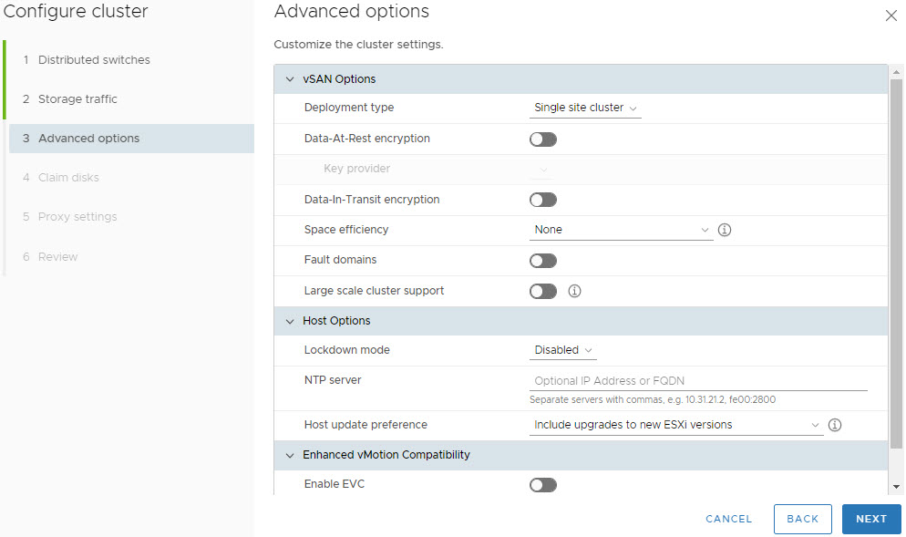 I did not make any changes on the Advanced Options, I did not claim any disks for vSAN, and I did not configure a proxy. Click “Next” until you get to the review screen. If satisfied with your choices, click “Finish.