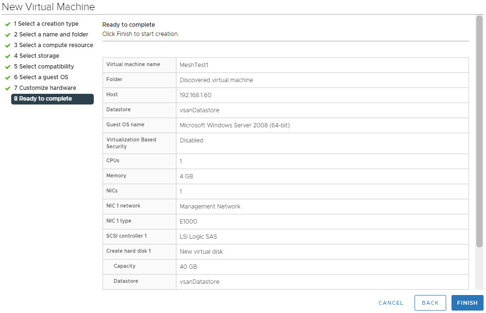 Now that we mounted our datastore, lets create a new VM on it. I just selected all of the defaults, but you could use a template to test with if you already had one deployed.