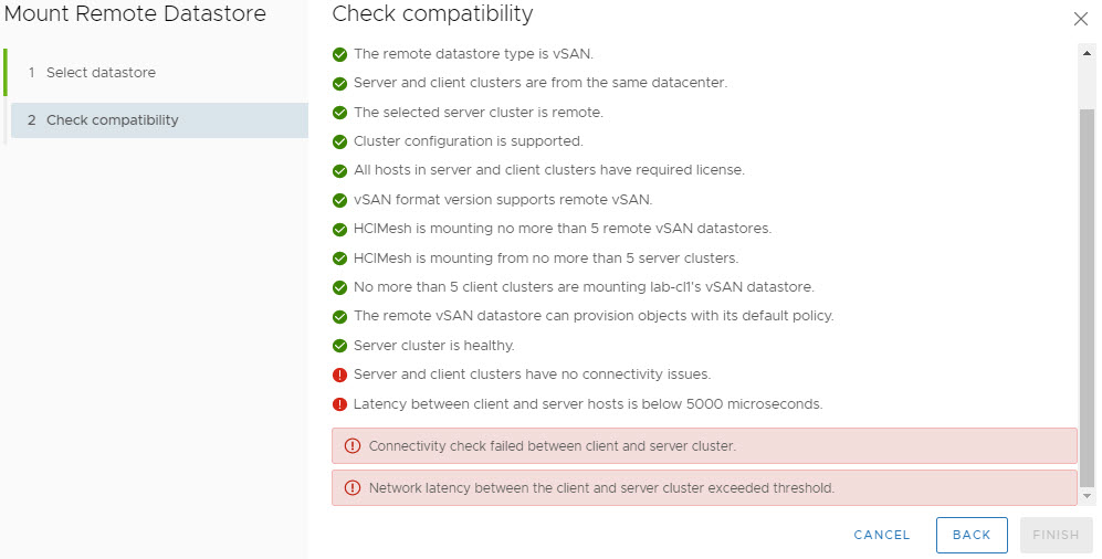 I chose “vsanDatastore” which is my physical storage for this cluster, all of the other datastores you see here are virtual.. Click “Next” and notice that this time our compatibility check is all green now because the vSAN networking is configured. Click “Finish”.