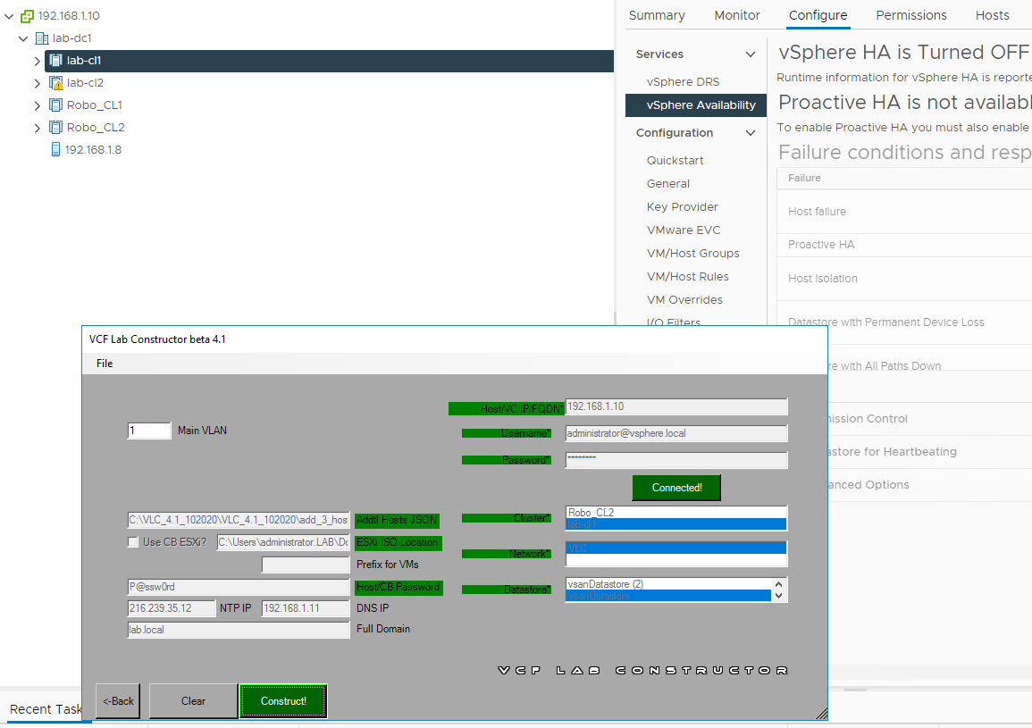 Input your main VLAN ID, then click on the “Addtl Hosts JSON” box and select the “add_3_hosts.json” we edited earlier. Click on the ESXi ISO location and choose the ISO that you should have downloaded earlier…you didn’t skip ahead did you? Input your password as well as NTP, DNS, and domain information. On the right side of the window input your vCenter credentials and hit Connect. Once connected it will show you what clusters, networks, and datastores are supported. The cluster I wanted to use (lab-cl1) is not showing up, this was because I had vSphere HA enabled.