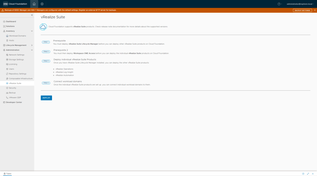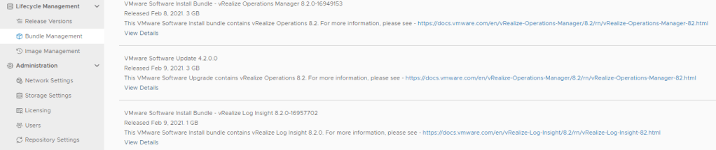 First we should start the download of the bundles for the vRealize suite. Within SDDC Manager go to Lifecycle Management–>Bundle Management and download all of the vRealize bundles. Now that we have the bundles downloading lets move on to the vRealize Suite tab.