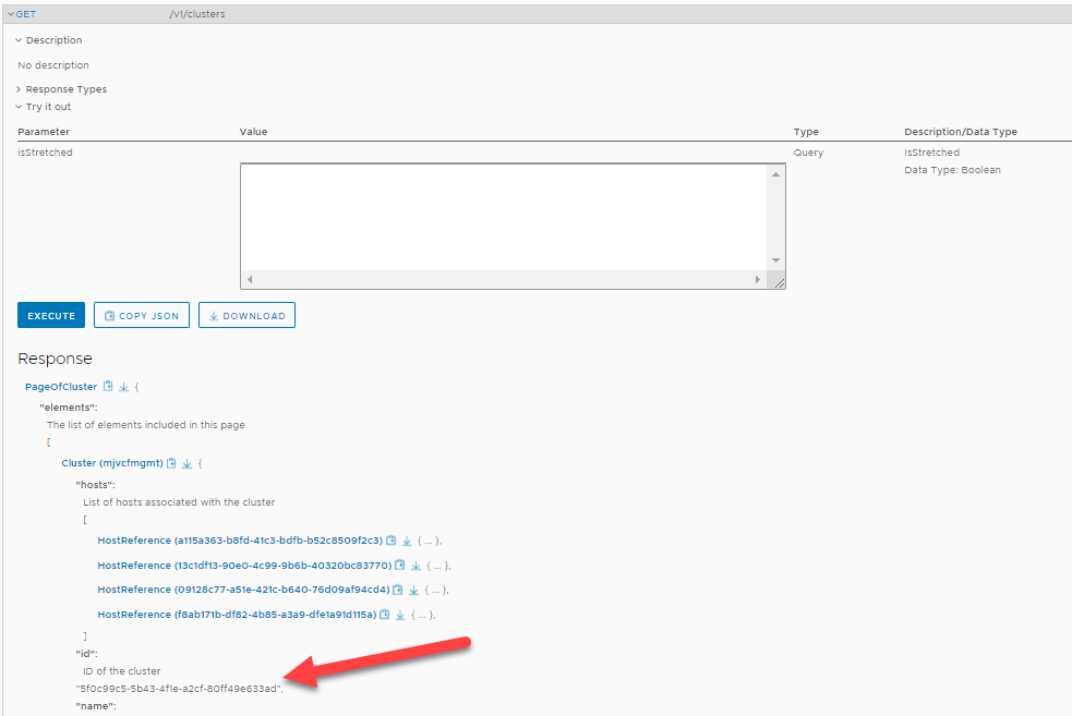 Within SDDC Manager on the navigation menu select “Developer Center” then click “API Explorer“. Expand “APIs for managing Clusters“. Click “Get /v1/clusters“, and click “Execute“. Copy the cluster ID into the script we were working on where is says to replace.