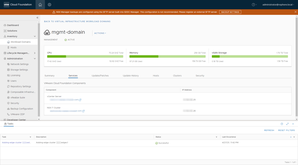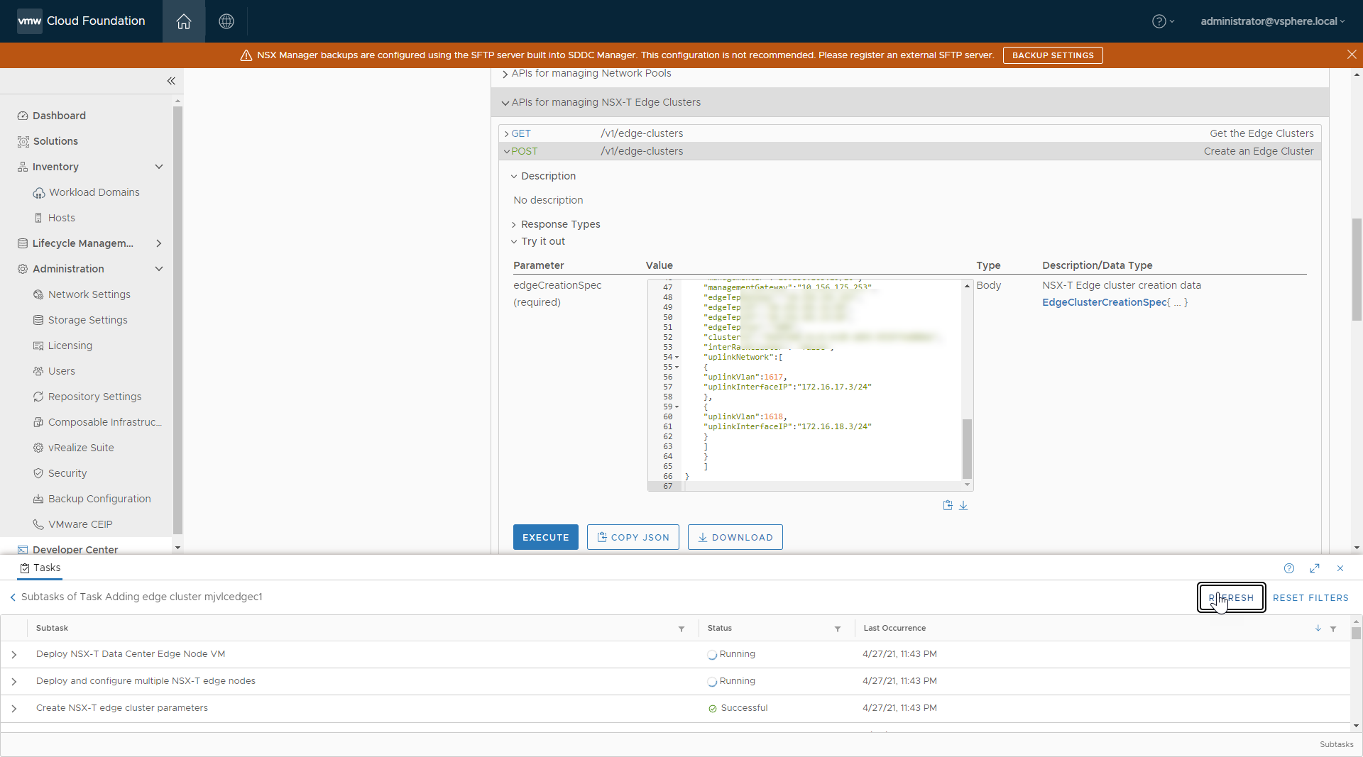 Great! Now we are ready to deploy. Expand “APIs for managing NSX-T Edge Clusters” and click “POST /v1/edge-clusters“. In the Value text box paste the validated JSON file contents and click “Execute“. We now see the edge nodes deploying and can follow the workflow in the Tasks pane from within SDDC Manager.