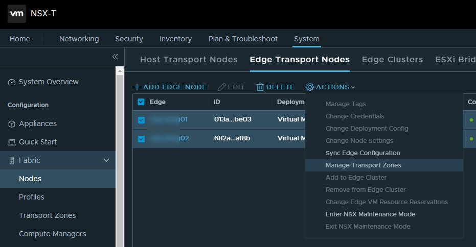Next, make sure that the edge node creation completed successfully. Once we see that successful task, we need to go to “System–>Fabric–>Nodes“. From the “Managed by” menu drop down select your management vCenter. Click “Edge Transport Nodes“. Check the box for both edge nodes and then from the “Actions” menu select “Manage Transport Zones“. From the “Transport Zone” drop down select the new transport zone we created and click “Add“.