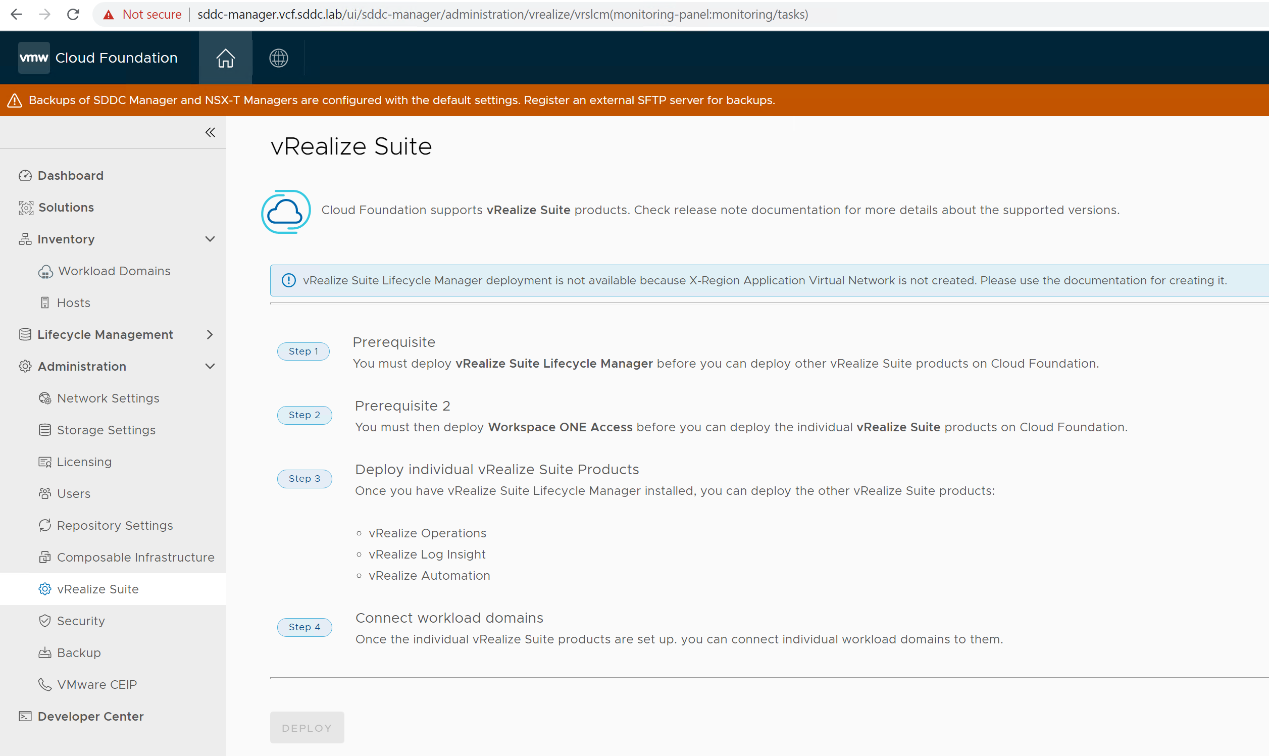 Usually the first indication that BGP/AVNs were not deployed comes from the vRealize deployment screen. Notice that the “Deploy” button is greyed out at the bottom with the message saying that the deployment isn’t available because there is no “X-Region Application Virtual Network”.