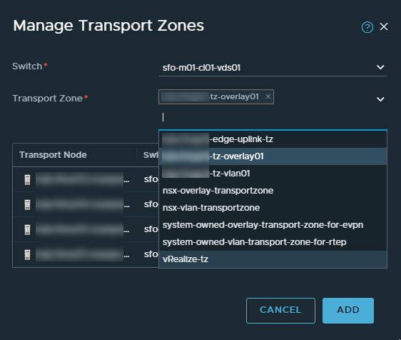 Now that we have our transport zone we need to add it to both our hosts and edge nodes. Navigate to “System–>Fabric–>Nodes“. Drop down the “Managed by” menu and select your management vCenter. Click on “Host Transport Nodes” if not already selected and then click each individual server, then from the “Actions” drop down select “Manage Transport Zones“. In the “Transport Zone” drop down select the transport zone we created earlier and then click “Add“.