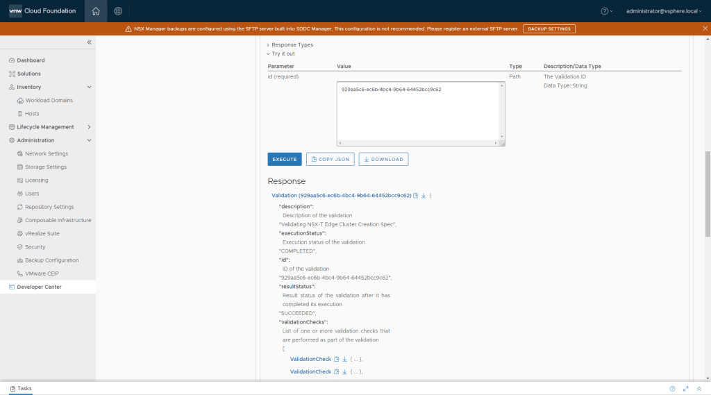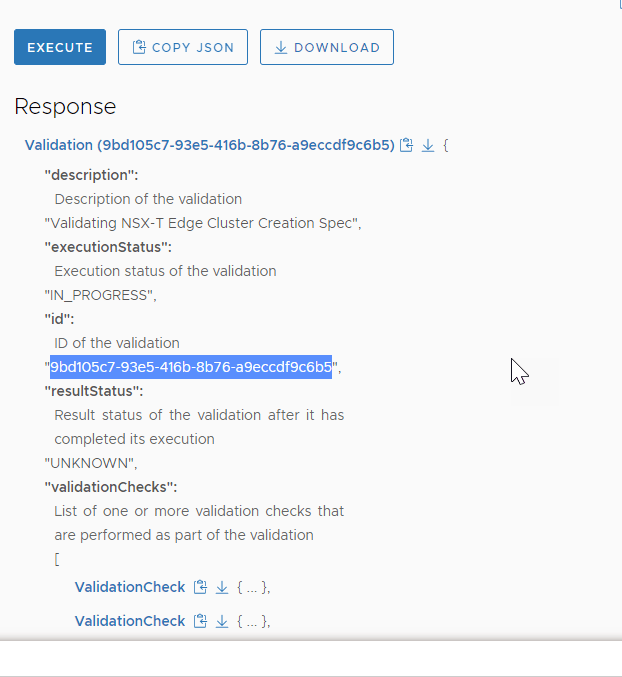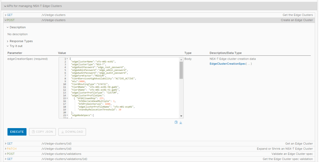 Now expand “APIs for managing NSX-T Edge Clusters“. Click “POST /v1/edge-clusters/validations. Copy the contents of your JSON file we created and paste into the “Value” text box then click “Execute“.