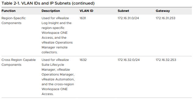 Next we have the networks that are going to be used by the vRealize Suite. Those two networks are Cross Region and Region Specific. The cross region is used for vRSLCM, vROPs, vRA, and Workspace ONE. The region specific network is used for Log Insight, region specific Workspace ONE and the remote collectors for vROPs.